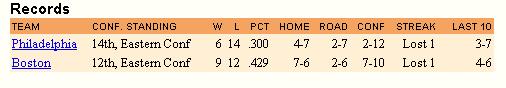 Record vs. Eastern Conference: Philadelphia 2-13; Boston 8-10